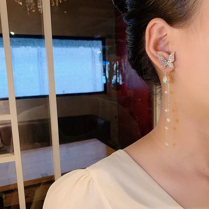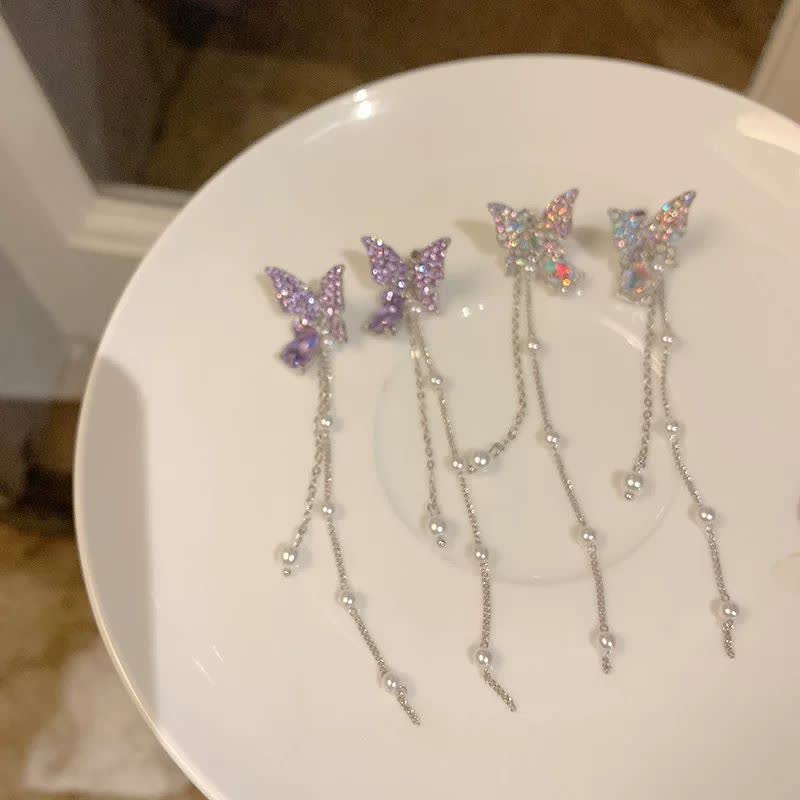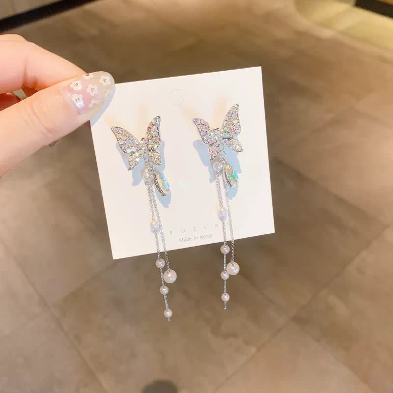 پروانهای نقرهای که انگار از باغهای پریها پرواز کرده – بالهای نگیندار درخشان + زنجیر آویز مروارید ظریف (جدا شدنی )